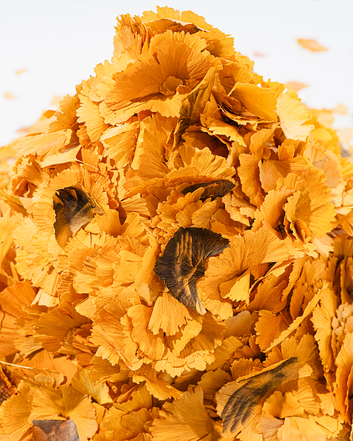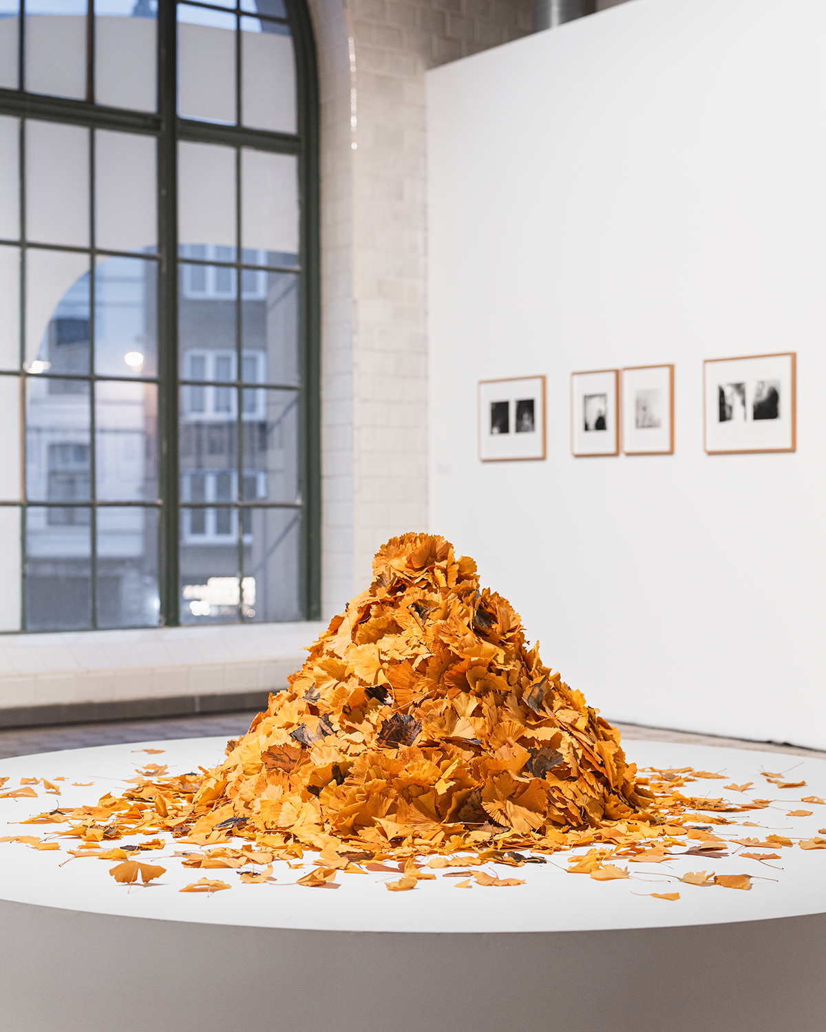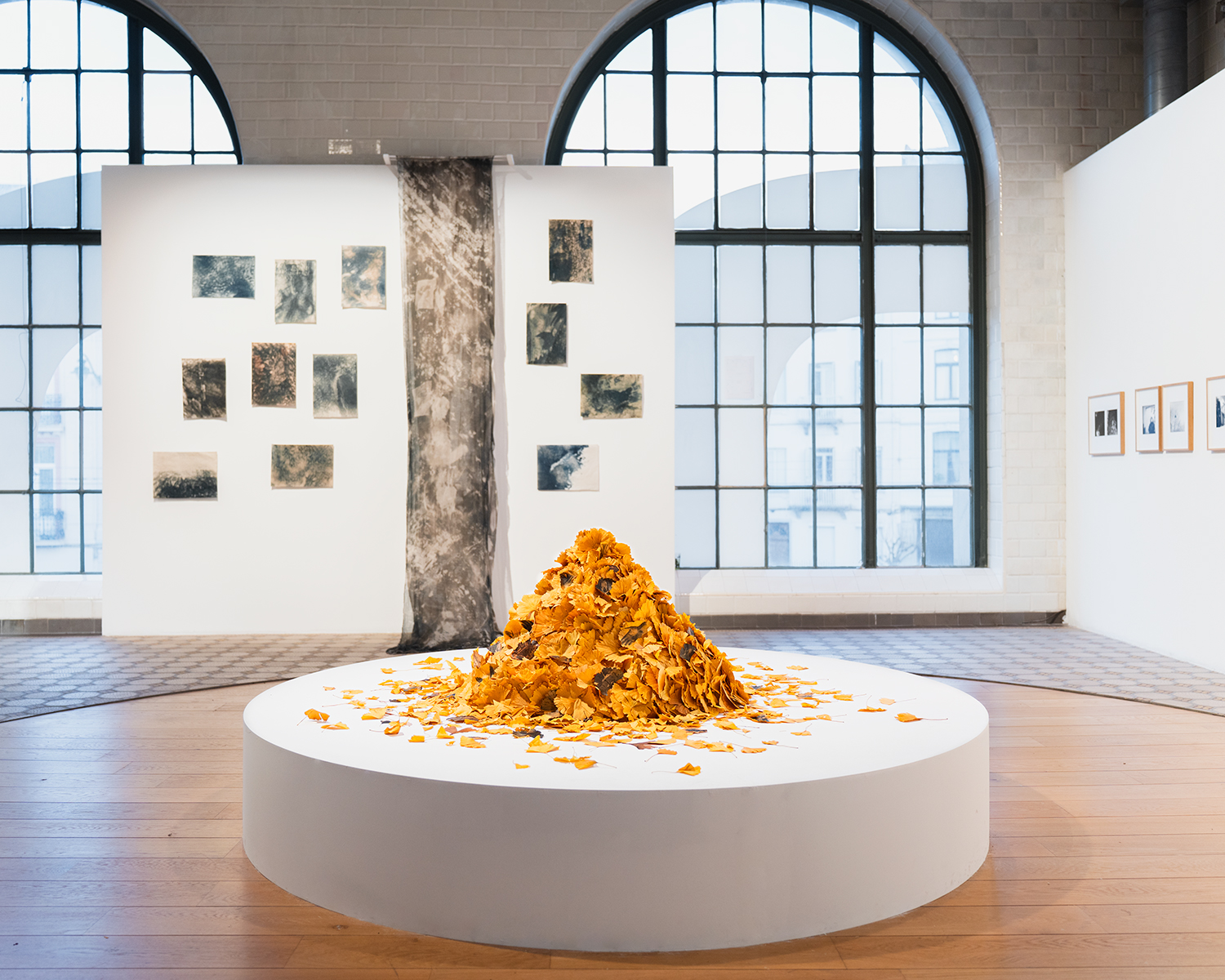 L’installation se déploie dans une forme ascendante de feuilles jaunes autour de laquelle le public est invité à tourner, tel un feu sacré. Les feuilles qui composent cette forme pyramidale proviennent du ginkgo biloba. Toutes sont jaunes, récoltées en automne. La majorité d’entre elles demeure vierge. D’autres feuilles, disséminées parmi elles, portent une image : un tirage argentique en noir et blanc, fruit d’un procédé que j’ai développé au terme d’une année d’expérimentation. Chaque feuille conserve sa souplesse, sa texture et ses nuances d’origine, tout en devenant empreinte photographique. Chaque feuille imprimée porte le dialogue entre image et matière, entre traces de l’enfance et fissures de l’armure adulte. Les photographies argentiques, développées manuellement sur les feuilles stabilisées, incarnent les fragments de cette armure déconstruite avec soin et portent l’écho d’un passé revisité. En s’élevant ensemble, toutes ces feuilles dessinent une métaphore de l’identité : instable, fragmentée, et toujours en devenir.